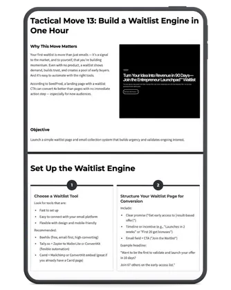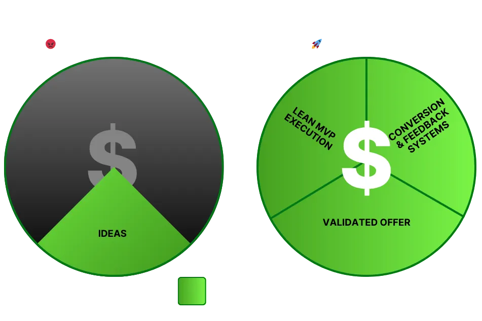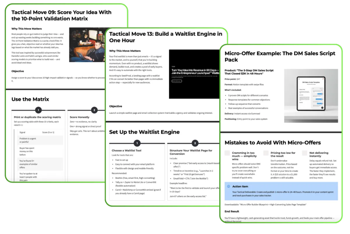 Your step-by-step roadmap to go from scattered ideas to validated offer, pre-sold MVP, and actual income — all in under 90 days.